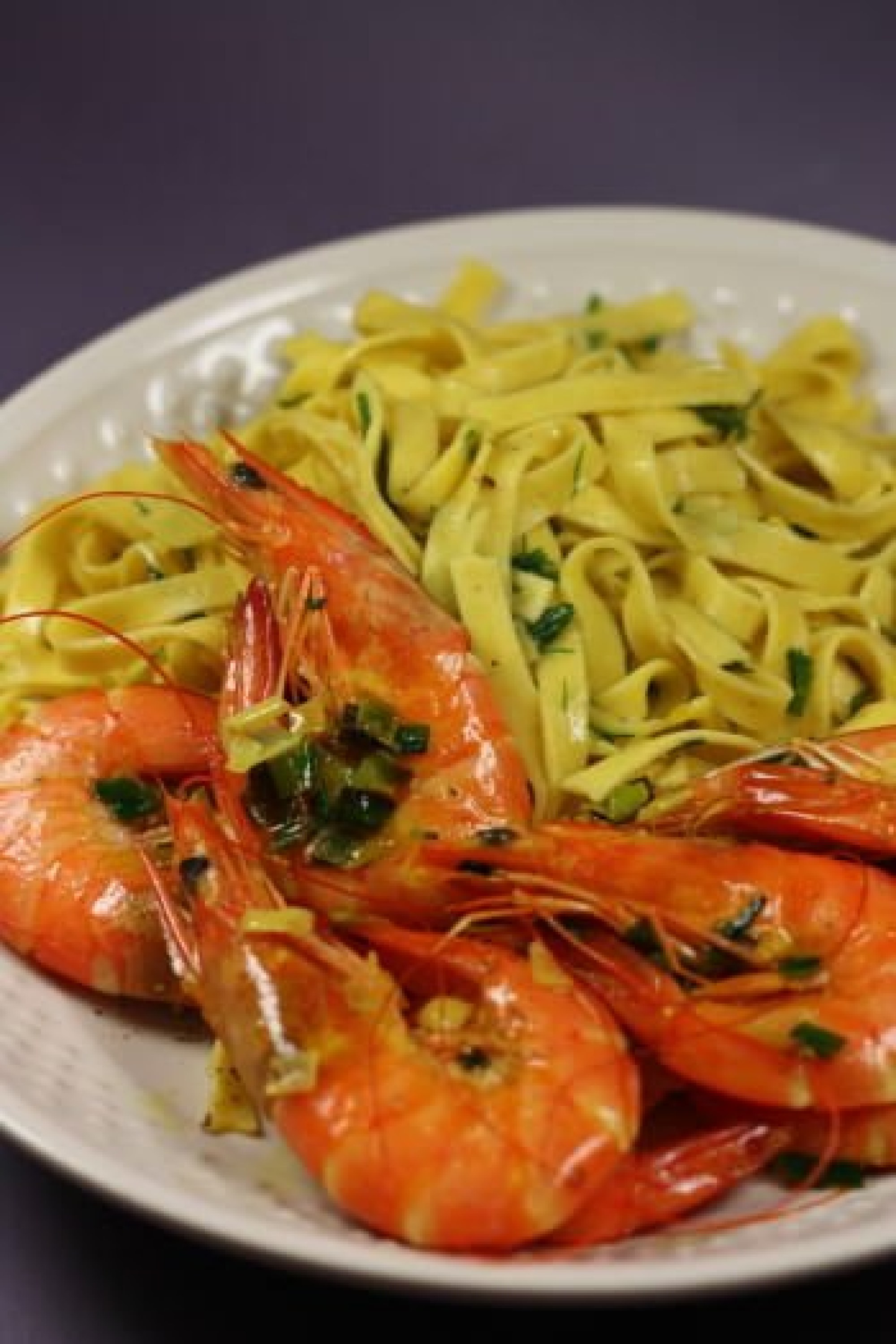 4. Faire chauffer un wok avec deux cuillères à soupe d’huile d’olive au citron. Y faire revenir l’aillet pendant 2 minutes en mélangeant régulièrement. Ajouter les crevettes. Saler, poivrer et ajouter le curcuma avant de mouiller avec le jus de citron. Laisser cuire quelques instants et arrêter la cuisson.